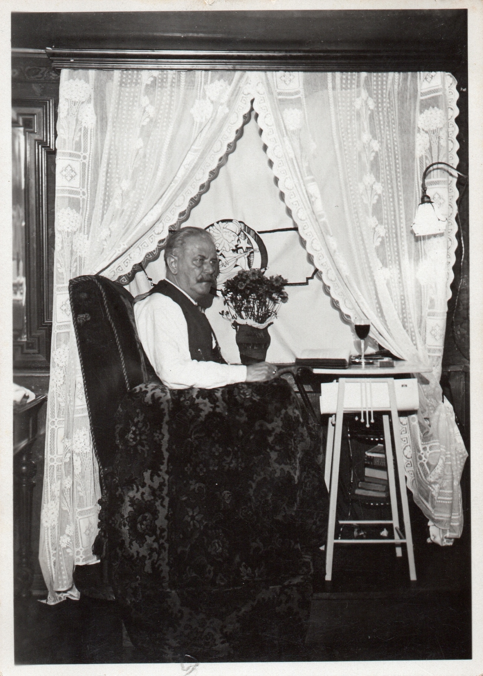 Grossvater Hugo Niedermaier mit seinem Gläsle Wein am Schreibpult. Er schrieb zwei Bücher in Bregenzer Mundart: "Wie die alten sungen" und "Immortellen". Da er sich viel in Schruns "im Grütt" aufhielt nannte er sich "Hugo vom Grütt".