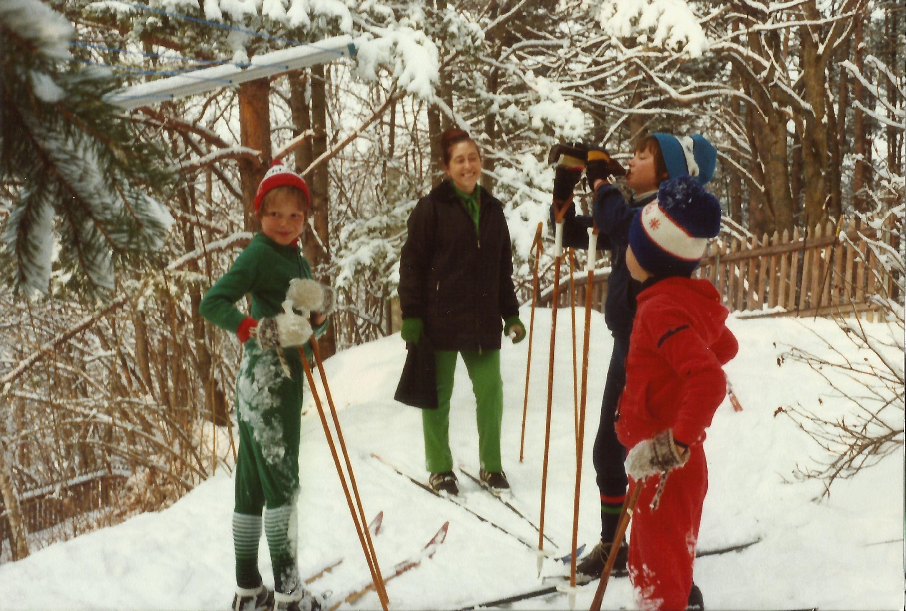 Von links: In unserem Garten im Februar 1978 meine Brüder Peter, Erik und Robin. Hinten in der Mitte Heidi Braschler, unsere Nachbarin.