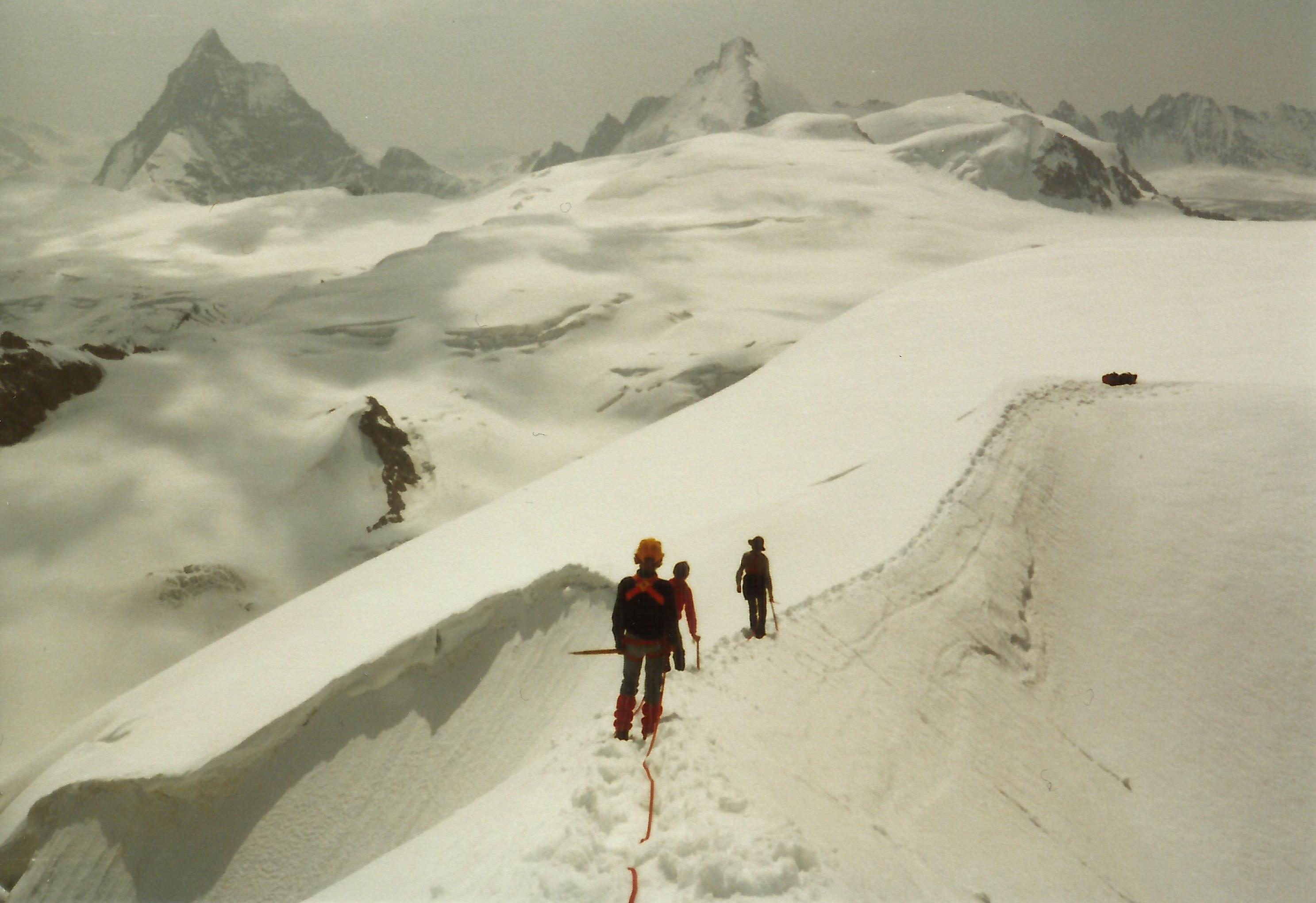 um 1980 ... Matterhorn und Dent d'Hérens im Hintergrund... Aufnahme in der Gegend von Tête Blanche auf ca. 3500 m.ü.M.